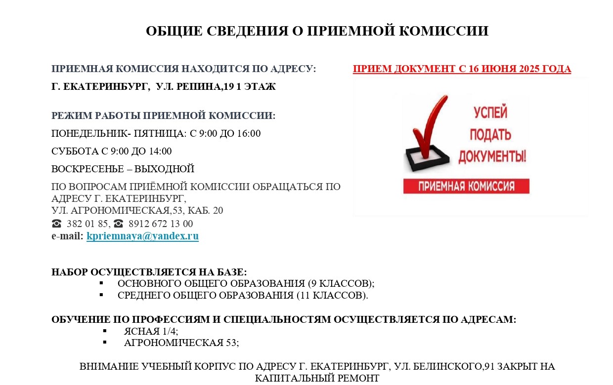 ПО ВОПРОСАМ ПРИЁМНОЙ КОМИССИИ ОБРАЩАТЬСЯ ПО АДРЕСУ Г. ЕКАТЕРИНБУРГ,